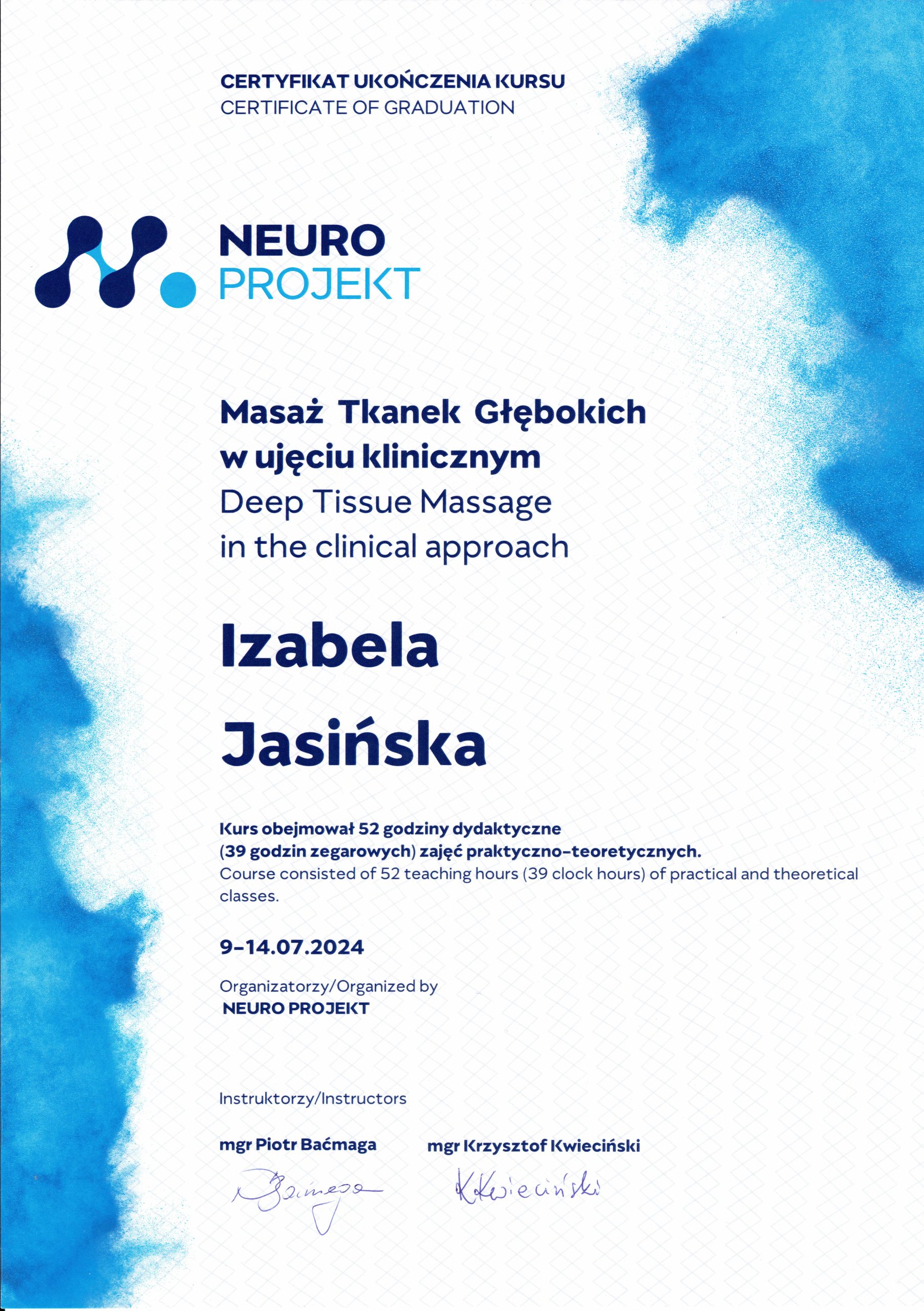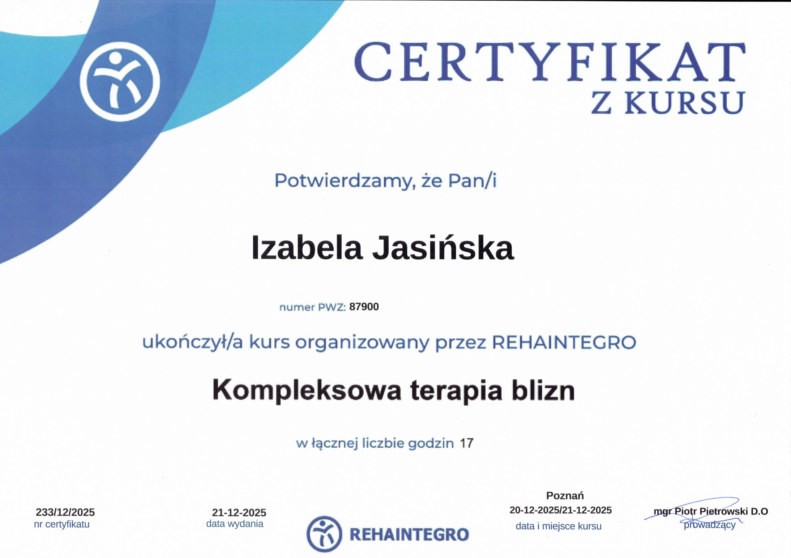 Jestem magistrem fizjoterapii i na co dzień pomagam osobom zmagającym się z bólem, ograniczeniami ruchu oraz przeciążeniami wynikającymi z codziennego funkcjonowania lub aktywności fizycznej. W swojej pracy łączę terapię manualną z ruchem oraz treningiem, ponieważ świadoma aktywność jest jednym z najskuteczniejszych narzędzi w poprawie sprawności i jakości życia.