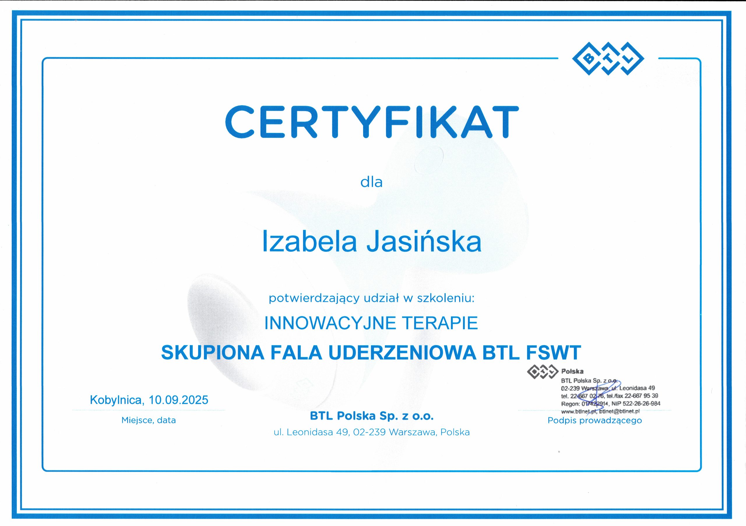 Od początku swojej pracy zawodowej stawiam na wysoką jakość usług, bezpieczeństwo oraz partnerską relację z pacjentem. Regularnie podnoszę swoje kwalifikacje i śledzę aktualne kierunki rozwoju fizjoterapii oraz treningu medycznego, aby oferować skuteczne i nowoczesne rozwiązania.